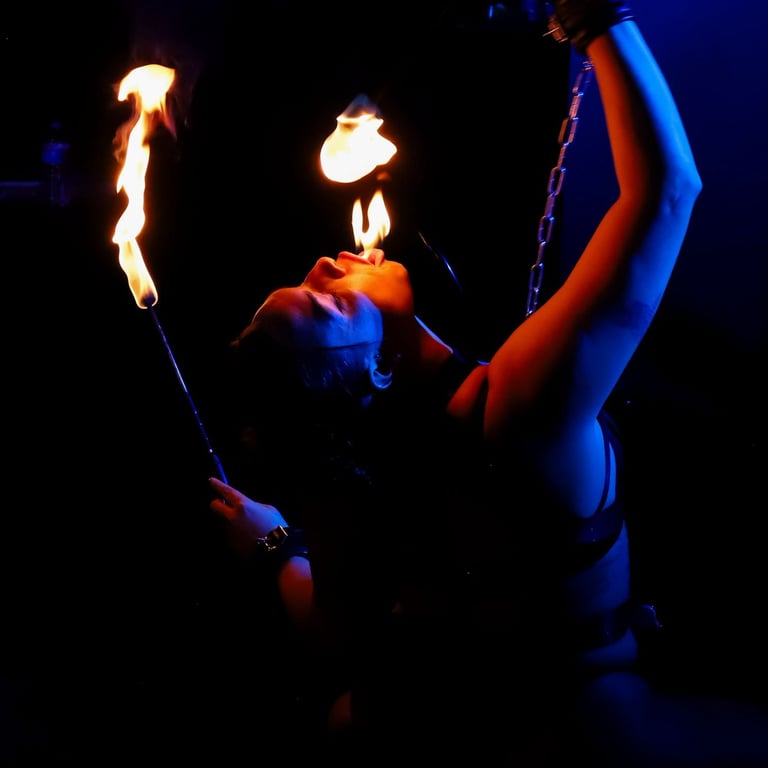 Performance formats include fire solo (eating, spinning, fans and body fire), fire duo (eating and body fire), rope/suspension duo and performing with whips.